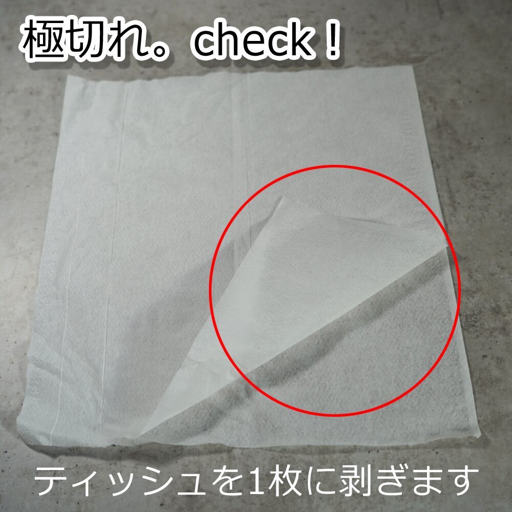 まず、乾いたティッシュペーパーを1枚に剥がします。ティッシュは濡らすと弱くなるため、切れ味を正確に測るためには、水分で破れないよう丁寧に扱います。