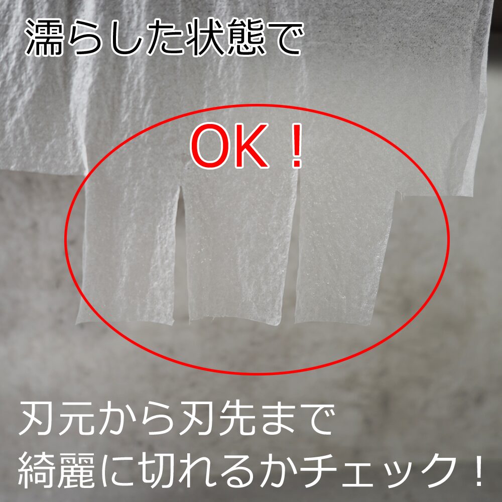 ハサミの切れ味をチェックするには、ごく薄い紙であるティッシュペーパーを使うのが効果的です。特に、湿らせて柔らかくしたティッシュをきれいに切れるかどうかで、刃先から刃元まで均一に研げているかを確認できます。