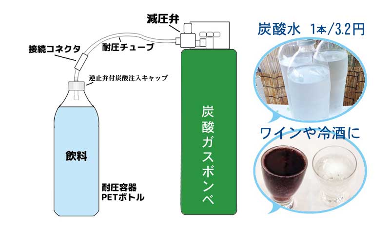 製造から販売まで一貫して行っています。中間業者といった流通経路がないため、その分効率的に安価でお届けできます。炭酸ガス注入時(炭酸水製造時)に必要な炭酸注入キャップは独自開発したものなので、 代用品を使用していません。ですから他社製品と比較した場合、安価に提供することができます。 意匠登録取得済みのため当社のみの取り扱いとなります。